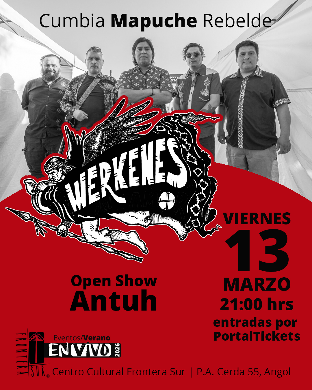 El viernes 13 de marzo, desde las 21:00 horas, el Centro Cultural Frontera Sur, ubicado en Pedro Aguirre Cerda, será escenario de una potente presentación de Werkenes del Amor, agrupación mapuche que ha creado un estilo distintivo que ellos mismos denominan “cumbia mapuche rebelde”. La jornada contará con un open show a cargo de Antuh, MC y artista urbano con trayectoria en la escena social y musical del Wallmapu.